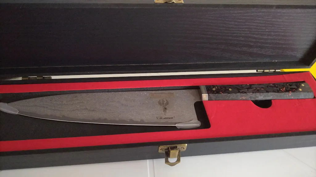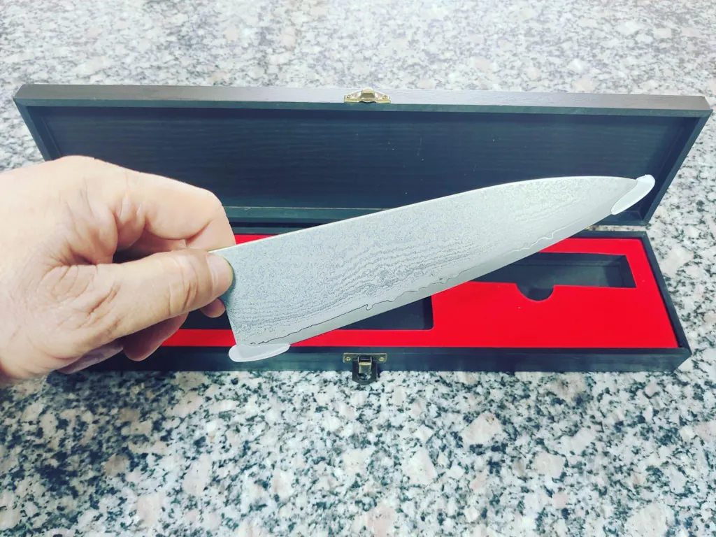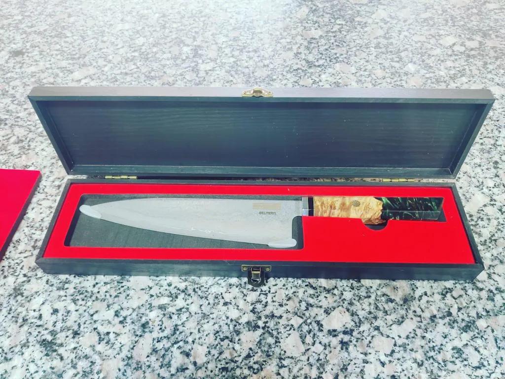En cuanto al diseño, la hoja es realmente hermosa y muy bien terminada. El mango es particularmente funcional y ayuda a mantener el cuchillo alineado y paralelo durante cortes consecutivos como julianas o concassé. Además, me encantan los cuchillos sin virola porque permiten un agarre tipo pinza mucho más natural, ideal para trabajar con velocidad y precisión. El cuchillo es liviano y muy bien balanceado, lo que permite usarlo durante horas sin que canse la mano. Actualmente lo guardo usando los protectores de punta que venían en el empaque original, no para proteger la punta sino para evitar que alguien lo tome sin fijarse y pueda lastimarse.