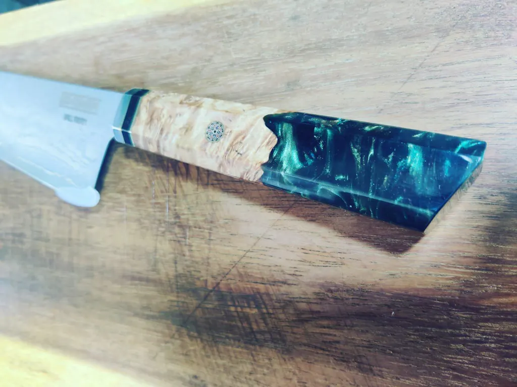 Madera de cedro tallada por artesanos cuchilleros siguiendo la tradicion de los cuchillos Japoneses! Con resina de color para mayor personalidad!