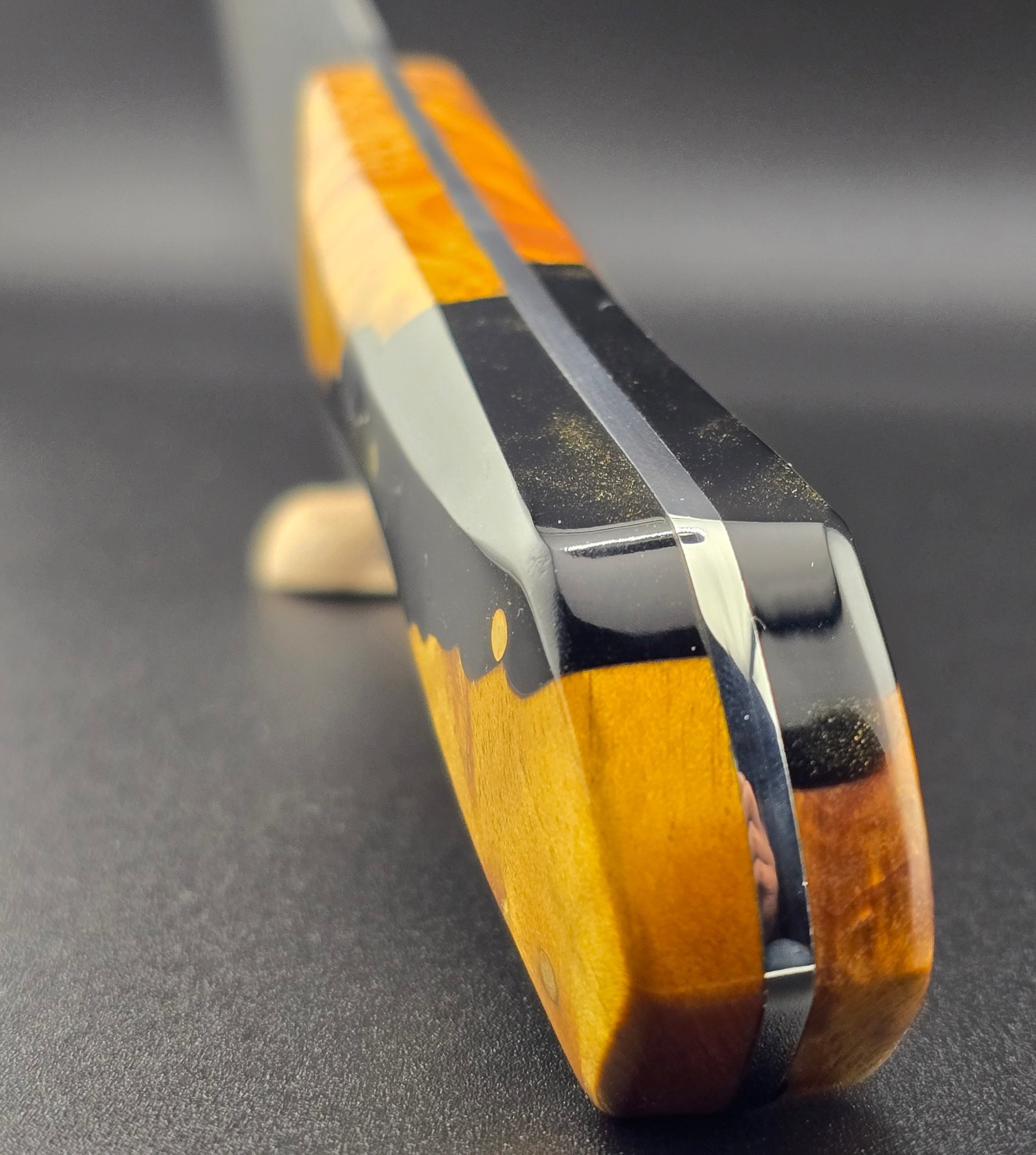 Mango de agarre ergonomico hecho de madera estabilizada con resina negra y destellos dorados! apariencia unica y elegante!